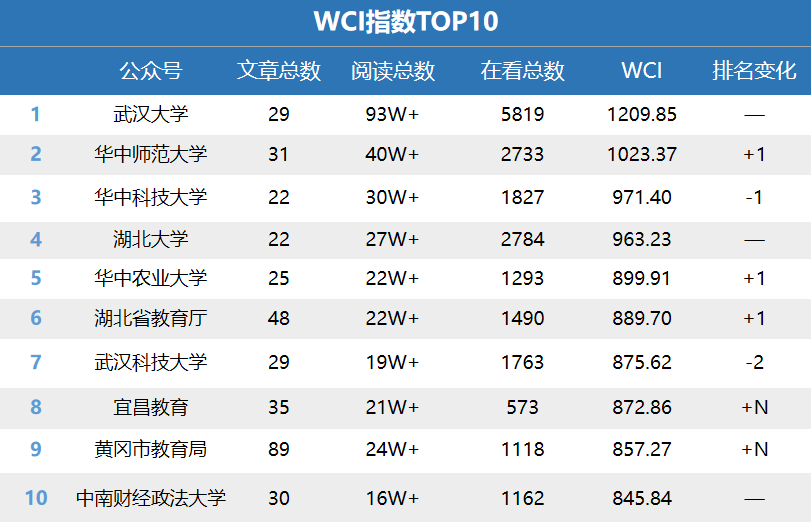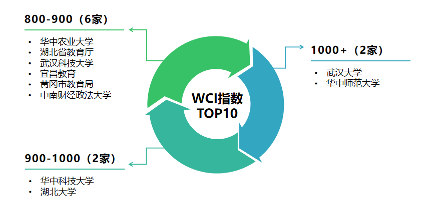 從WCI指數(shù)來看,本期TOP10微信公眾號WCI指數(shù)得分均有不同程度下降。雖然最好成績?nèi)匀槐3衷?200+,但超過1000的賬號僅有兩家,分別是“武漢大學(xué)”“華中師范大學(xué)”,較上期的4家相比下滑明顯;指數(shù)在900-1000區(qū)間的有2家,分別為“華中科技大學(xué)”“湖北大學(xué)”,可見,WCI數(shù)值900以上的賬號總共只有4家,與上期的8家相差甚遠(yuǎn),其余均分布在800-900區(qū)間。總體來看,頭部賬號、中部賬號收縮明顯,以800到900區(qū)間居多。