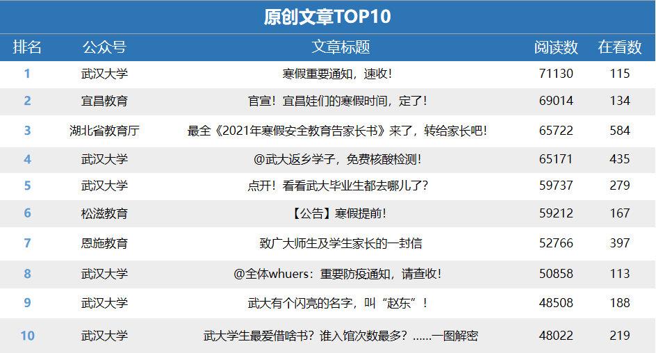1月份,原創(chuàng)文章TOP10中未出現(xiàn)閱讀量破10萬+的文章。時(shí)值學(xué)生放寒假,原創(chuàng)文章排名前三的均為寒假事宜相關(guān)內(nèi)容。此外,學(xué)生春節(jié)返鄉(xiāng)核酸檢測、學(xué)校防疫措施等內(nèi)容也受到較多關(guān)注。在本期原創(chuàng)文章榜單中,武漢大學(xué)仍然處于強(qiáng)勢地位,10席位置占據(jù)6席,內(nèi)容除了時(shí)效性較強(qiáng)的寒假通知、防疫措施外,也有與學(xué)生日常息息相關(guān)的畢業(yè)就業(yè)、圖書借閱以及優(yōu)秀表彰等內(nèi)容。其中,《@武大返鄉(xiāng)學(xué)子,免費(fèi)核酸檢測!》一文內(nèi)容是學(xué)校為學(xué)生提供核免費(fèi)酸檢測便利服務(wù),得到眾多學(xué)子歡迎并轉(zhuǎn)載傳播,傳播效果較好,獲得400余次在看數(shù),名列榜單第二名。此外,原創(chuàng)文章TOP10其余4席均來自政務(wù)賬號,包括宜昌教育、湖北省教育廳、松滋教育、恩施教育,發(fā)布內(nèi)容均為寒假相關(guān)事宜,以實(shí)用性受到學(xué)生和家長關(guān)注。