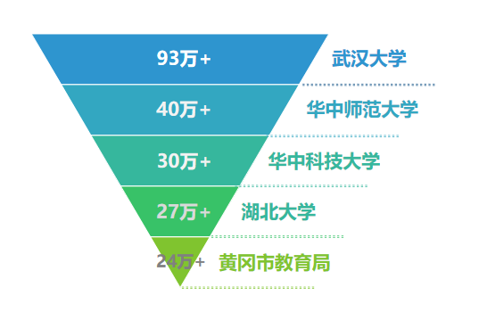 從文章閱讀總量來看,本期榜單閱讀總量總體下降趨勢明顯。“武漢大學(xué)”以93萬+的閱讀量仍舊穩(wěn)守榜首位置,與第二名拉開較大差距,但其自身與上期相比掉下百萬閱讀量行列;第二名“華中師范大學(xué)”的閱讀總量為40萬+,在保持上期水平的基礎(chǔ)上略有上升,直接拉升了排名次序;“華中科技大學(xué)”30萬+的閱讀量與上期相比下降近一半,跌幅明顯;“湖北大學(xué)”以27萬+的閱讀量排名第四;“黃岡市教育局”以24萬+的閱讀量排名第五,較前期相比提升明顯,拉升了自身排名情況。