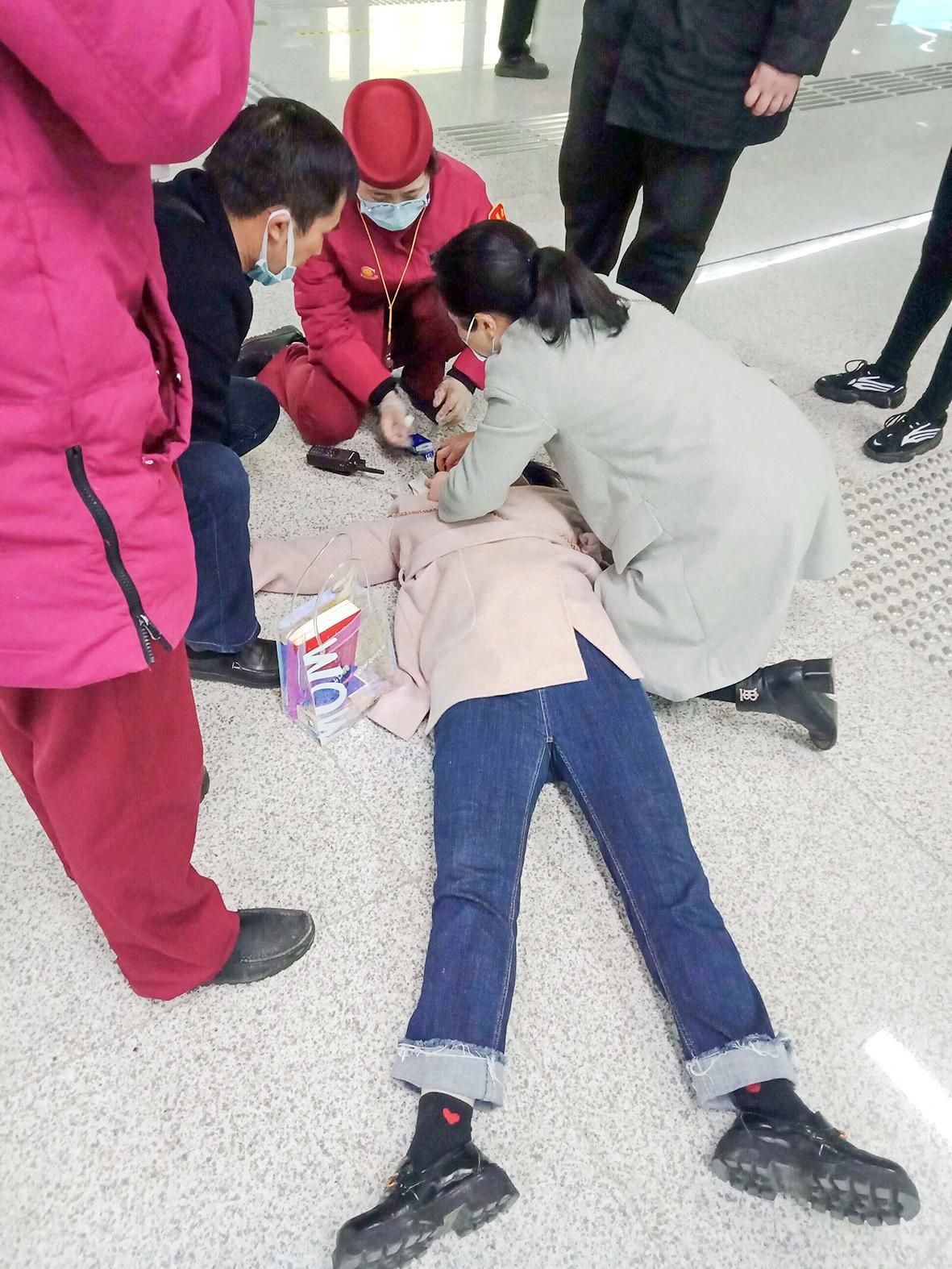 2月18日下午5時許,地鐵1號線大智路站。列車到站開門后,一位乘客在其朋友的攙扶下剛走出車門,就全身抽搐突然倒地。值班站長黃婷和駐站民警快速到達現(xiàn)場,詢問發(fā)病情況,疏導圍觀乘客。