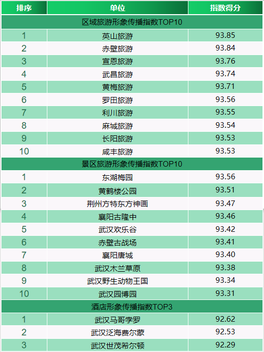 6.榜單監(jiān)測(cè)范圍包括省內(nèi)近200家景區(qū)、酒店,監(jiān)測(cè)樣本和數(shù)量每周會(huì)根據(jù)實(shí)際情況進(jìn)行微調(diào)。歡迎各景區(qū)運(yùn)營(yíng)部門(mén)或負(fù)責(zé)人自薦,加入排行榜(聯(lián)系電話(huà):027-88567710);