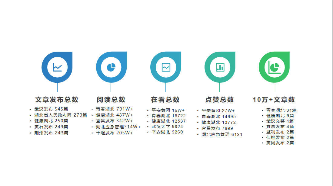 1、聚集湖北省內主要黨政機關政務微信公眾號,根據WCI指數數據進行科學排行,主要從“整體傳播力”、“篇均傳播力”、“頭條傳播力”、“峰值傳播力”四個維度進行評價。