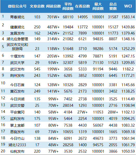 2021年1月WCI指數前二十榜單中,“青春湖北”仍舊穩居第一,“健康湖北”和“宜昌發布”重回第二和第三,“武漢市文化和旅游局”由上期的第二名降至第五名。本期最大亮點是10W+文章總數達64篇,和上期(41篇)相比,增量高達56%;而且,全榜WCI指數整體呈上升趨勢,以前20名為例,和上期相比總體增長493.2,其中前三名均有增長。