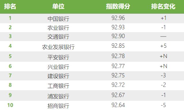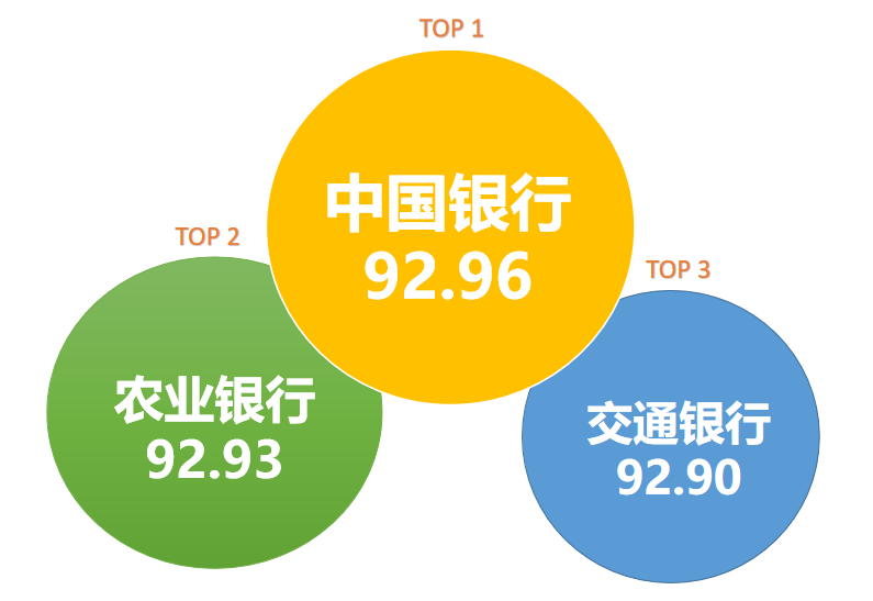 前三名仍舊被中國銀行、農業銀行、交通銀行三家包攬,但在具體排名順序上出現了變化,中國銀行升至首位,農業銀行降至第二名,交通銀行排名穩定,守住第三位。本期上榜銀行分數較上期整體有所下滑,未有銀行傳播指數數值達到93以上,與上期有6家銀行指數在93以上相比相差甚遠。在前十榜單中,農業發展銀行排名顯著上升,平安銀行、興業銀行成績上升成功入榜,其余四家建設、招商、浦發、招商銀行的排名情況均有不同程度下滑,與此同時,光大銀行、漢口銀行跌出榜單。