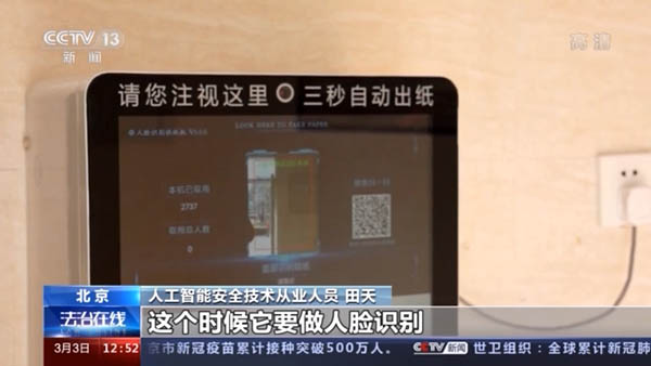 人工智能安全技術從業人員 田天:其實作為一項新興技術,大家對它還是有一定興奮感的,想在各種場合都用人臉識別,比如說我看到的一些比較夸張的例子,有把人臉識別放在公共衛生間外面去拿衛生紙,這個時候他要做人臉識別,其實這些都是涉及到一些程度上的濫用吧。還是需要把它應用在一些更關鍵、真正有必要的一些場景。
