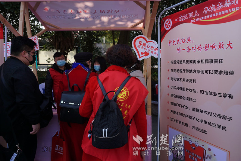 荊楚網(湖北日報網)訊(記者王舒嫻 郭蕾)3月4日上午,在由漢陽區委、區政府主辦,漢陽區委宣傳部、荊楚網、漢陽區民政局共同承辦的2021年“漢陽區學雷鋒志愿服務月”活動現場,荊楚網荊楚問政欄目組聯合漢陽區11個街道特色志愿服務項目團隊,為群眾提供網絡留言辦理、義診、法律咨詢、垃圾分類宣傳等志愿服務,面對面為老百姓解決問題。