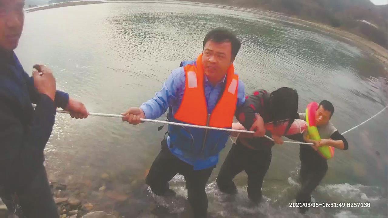 “不要慌張,后退到安全地帶,我們馬上來救你!”徐周成大聲向王女士喊話,并立即向所長劉嚴及鄉政府報告,請求支援。在判斷周邊環境后,徐周成決定讓蘭新港留在岸邊,固定救援繩,自己和徐昌軍、張聰牽著救援繩的另一頭,蹚河救人。