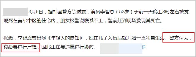 韓國警方證實,在3月7日晚8點警方是在接到“李智恩不接電話”的報案后趕赴現(xiàn)場(李智恩的家),隨后李智恩于自己的家中被發(fā)現(xiàn)時就已處于死亡狀態(tài)。