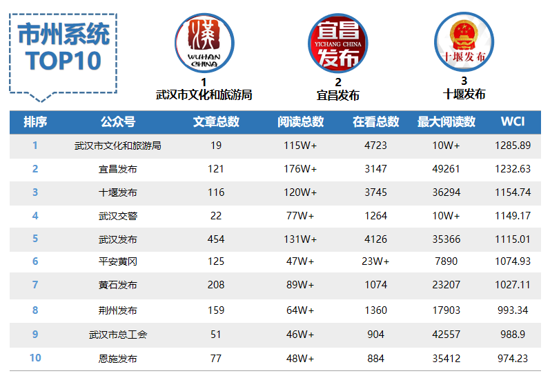 3月10日,由荊楚網(wǎng)(湖北日報(bào)網(wǎng))、楚天輿情數(shù)據(jù)研究院制作的湖北市州微信排行榜2月榜單發(fā)布。與上期相比,WCI指數(shù)排名前三的位置再次出現(xiàn)細(xì)微變化,“武漢市文化和旅游局”和“宜昌發(fā)布”位置互換,“武漢市文化和旅游局”成為本期第一,“宜昌發(fā)布”成為本期第二,“十堰發(fā)布”守住了榜單第三名的位置。