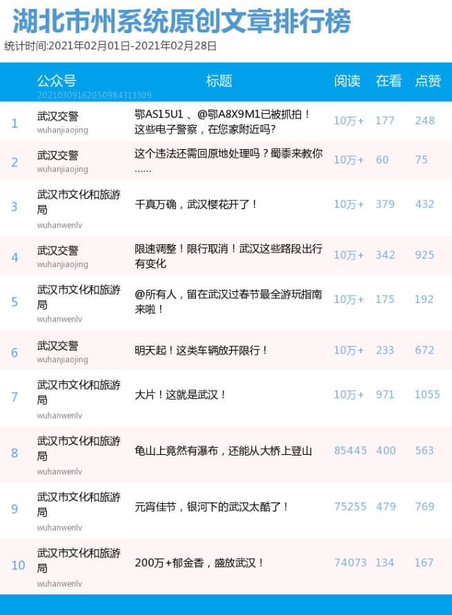 從文章閱讀量看,本期僅“武漢市文化和旅游局”和“武漢交警”2家單位收獲了10萬+文章,并且在原創(chuàng)內(nèi)容領(lǐng)域有所建樹,相關(guān)文章《鄂AS15U1 、@鄂A8X9M1已被抓拍!這些電子警察,在您家附近嗎?》《這個(gè)違法還需回原地處理嗎?蜀黍來教你……》《千真萬確,武漢櫻花開了!》《大片!這就是武漢!》《@所有人,留在武漢過春節(jié)最全游玩指南來啦!》或因直切網(wǎng)民出行最為關(guān)切的電子眼抓拍問題、違法處理問題,或因緊跟時(shí)節(jié),滿足市民踏青出游需求,兼具實(shí)用性、趣味性和美觀性而收獲10萬+的閱讀量。