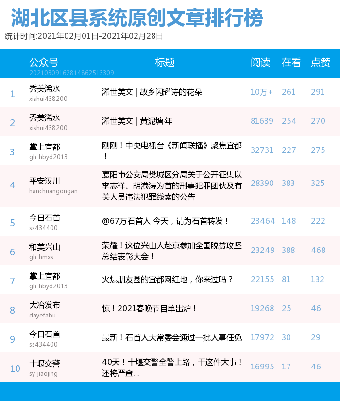 湖北區縣微信排行榜2月榜單前十