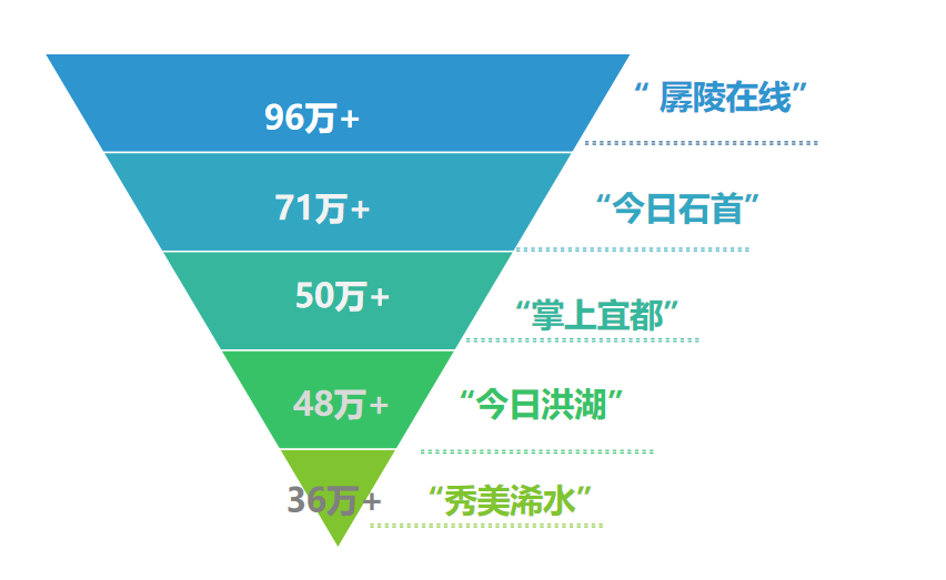 本期上榜微信公眾號閱讀總量近于“腰斬”,其中“孱陵在線”閱讀總量減少69萬(上期165萬)、今日石首減少57萬(上期128萬)、“今日洪湖”減少51萬(上期99萬)。分析來看,首先是受春節假期影響,整體發文量減少幅度較大,直接導致了文章閱讀總量的下降;其次是市民生活重點轉移到其他方面,對賬號推文打開率及關注度整體偏低。