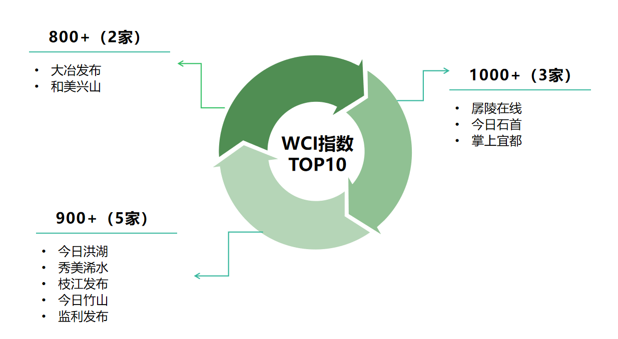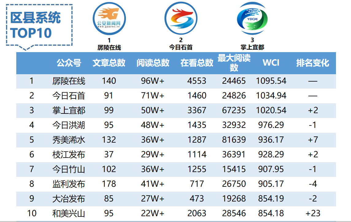 本期上榜公眾號大部分指標遠不及1月,具體來看,一是文章總數驟減,發文量減少30篇以上的賬號有5家,分別為“今日石首(33篇)”“今日洪湖(40篇)”“秀美浠水(58篇)”“今日竹山(36篇)”“南漳發布(33篇)”,作用到傳播數據上來看則是閱讀總量和在看總數的近乎腰斬。二是WCI指數變動明顯,本期超過1000+的賬號僅3家,與上期7家相比降幅較大,且最高WCI值(1095.54)與上期(1213.93)相比差距達到118,矩陣下跌態勢明顯。從具體排名來看,“秀美浠水”和“和美興山”進步最為明顯,排名分別上升7位和23位。