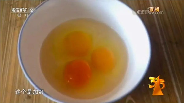 專家介紹,為了迎合消費者的需求,部分養殖者在飼料中添加著色劑以增加雞蛋蛋黃的顏色,2019年“315”晚會曝光了“化妝”雞蛋就是養殖戶在飼料中添加了著色劑,使蛋黃顏色更深,以此冒充“土雞蛋”。
