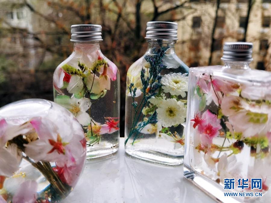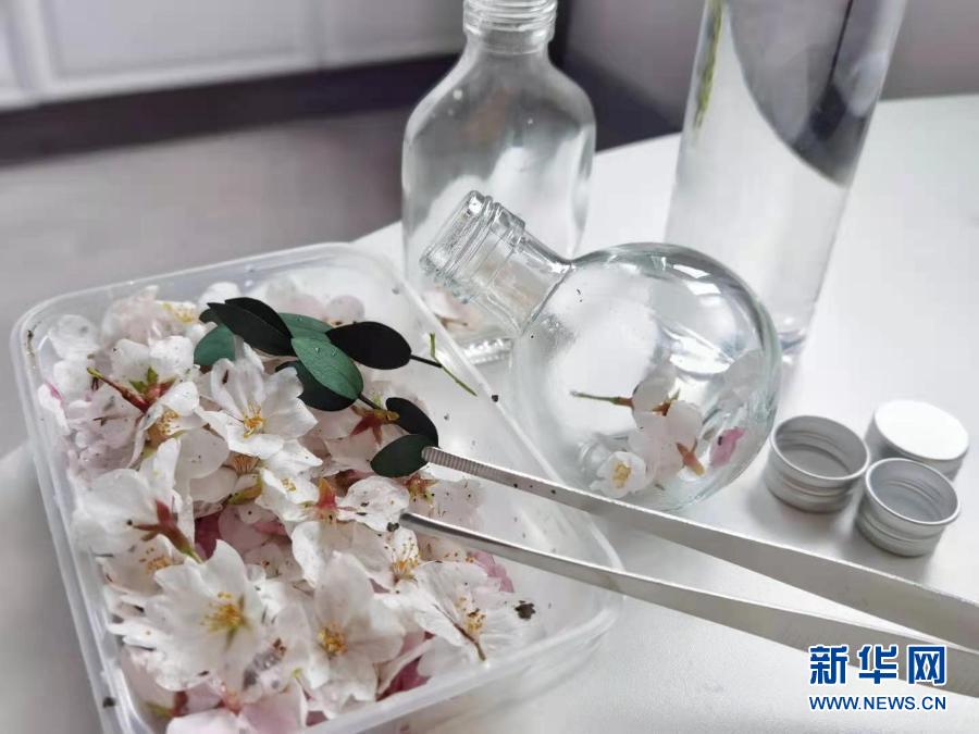 撿回來后,她又將花瓣壓干,并網購了數十個玻璃瓶和專用的保鮮油,將干葉和干花放入瓶中,再倒入保鮮油,做出漂亮的櫻花瓶。