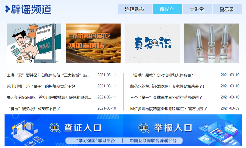 3月12日,中國互聯網聯合辟謠平臺與“學習強國”學習平臺共建的“辟謠平臺”頻道正式上線?!氨僦{平臺”將圍繞習近平總書記關于網絡綜合治理的重要論述,依托雙方內容、平臺優勢,宣傳網絡安全、網絡空間治理政策法規,為廣大讀者提供權威辟謠信息以及舉報查證服務,幫助讀者提高辨別謠言和虛假信息的能力,助力清朗網絡空間。