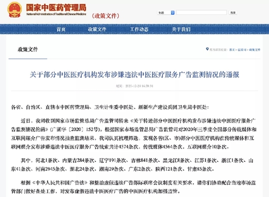 早在去年底,國家中醫藥管理局曾發布通報稱,2020年三季度全國各省部分中醫醫療機構在傳統媒體和互聯網媒介發布涉嫌違法中醫醫療服務廣告線索共計4574條次,其中傳統媒體就占了4564條次。
