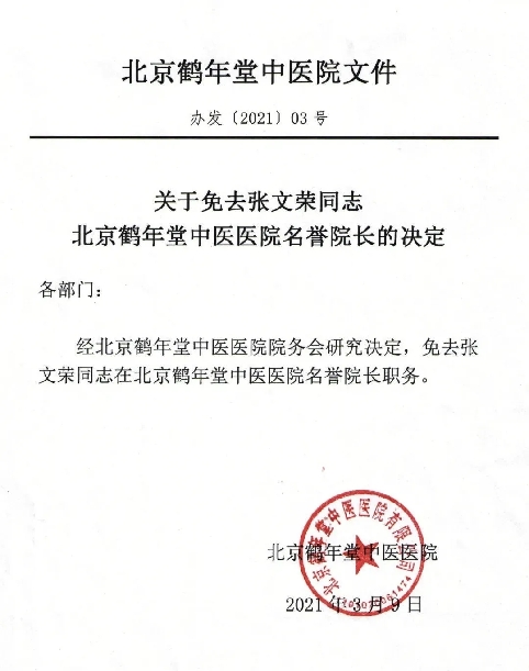 在得知此事后,3月9日,張文榮被其坐診的其中一家醫院——北京鶴年堂中醫醫院免去了名譽院長稱號并解除合作。