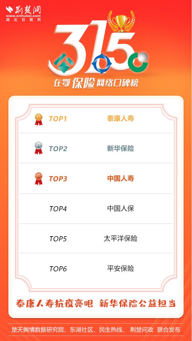 3月15日,荊楚網(湖北日報網)、楚天輿情數據研究院發布在鄂保險網絡口碑榜,泰康人壽、新華保險、中國人壽位居前三甲。