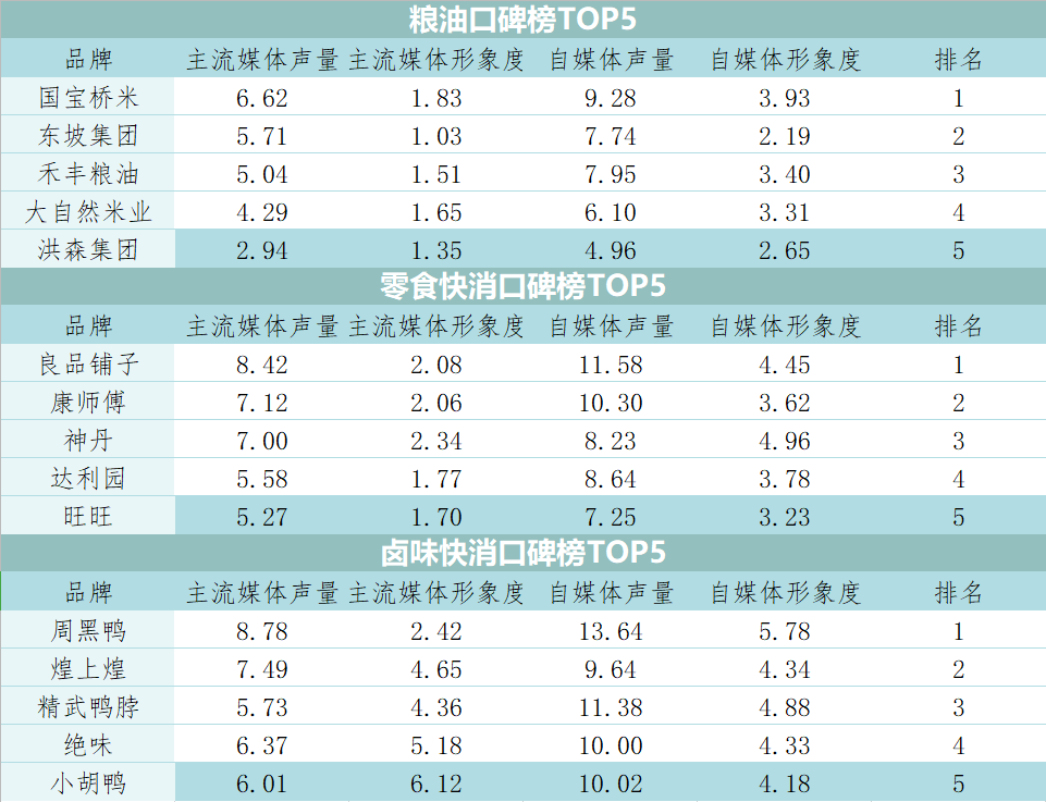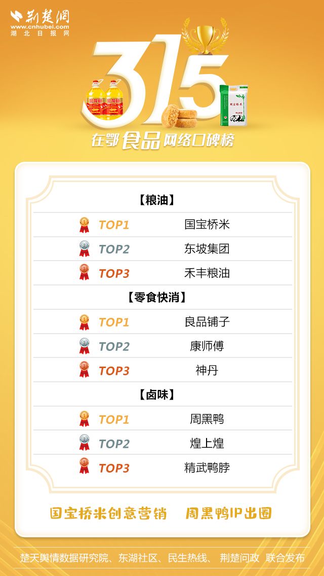 3月15日,荊楚網(wǎng)(湖北日?qǐng)?bào)網(wǎng))、楚天輿情數(shù)據(jù)研究院發(fā)布3·15在鄂食品行業(yè)口碑榜,包括糧油口碑榜、零食快消口碑榜、鹵味快消口碑榜等3個(gè)細(xì)分行業(yè)。15家上榜商家對(duì)于網(wǎng)絡(luò)消費(fèi)投訴能夠及時(shí)響應(yīng)、妥善處理,整體形象較好,且在正面宣傳報(bào)道上各有千秋。具體排名來(lái)看,國(guó)寶橋米、良品鋪?zhàn)印⒅芎邙喴愿咂毓舛取⒏咧犬?dāng)選細(xì)分領(lǐng)域第一名。