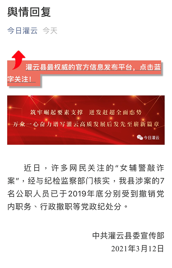 對此,灌云縣融媒體中心公眾號“今日灌云”3月12日回應稱,經與紀檢監察部門核實,該縣涉案的7名公職人員已于2019年底分別受到撤銷黨內職務、行政撤職等黨政紀處分。