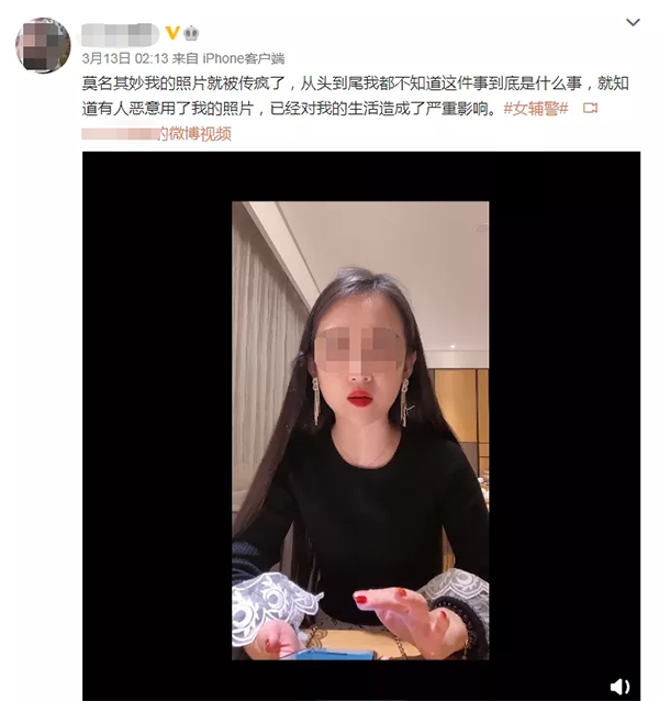 13日,河南省洛陽市的汪女士通過個人微博發布視頻稱,她此前發布在朋友圈的個人照片被謠傳為“女輔警敲詐案”當事女輔警,照片被配上案件相關內容,在微博、貼吧、今日頭條等平臺流傳。