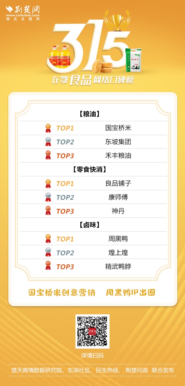 在鄂食品行業網絡口碑榜包含糧油、零食快消、鹵味快消3個細分行業,15家上榜商家對于網絡消費投訴能夠及時響應、妥善處理,整體形象較好,且在正面宣傳報道上各有千秋。國寶橋米、良品鋪子、周黑鴨以高曝光度、高知名度當選各細分領域第一名。