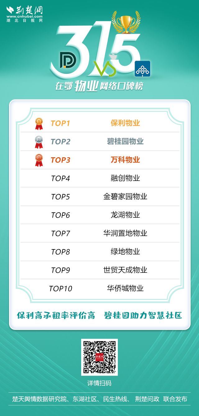 物業是社會治理中的“最小單元”,其作為與否關乎居民生活的幸福感和滿意度。在鄂物業行業網絡口碑榜上,保利物業、碧桂園物業、萬科物業位居三甲。