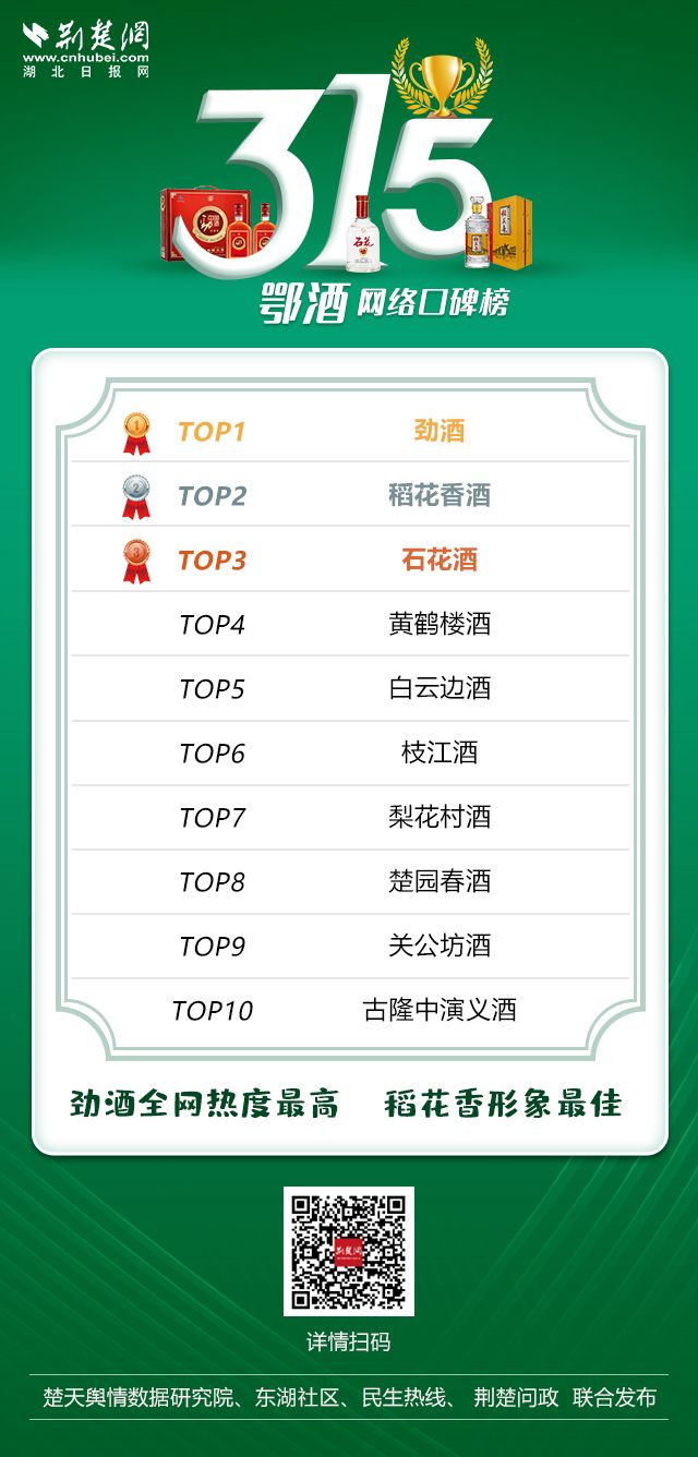 鄂酒網絡口碑榜上,勁酒、稻花香酒、石花酒位居前三。稻花香正面宣傳亮點頻出推升品牌形象度,勁牌善于策劃活動讓全網熱度居高,白云邊產品市場占有率提升了其整體聲量和形象度,黃鶴樓酒業和枝江酒業也進入前十。