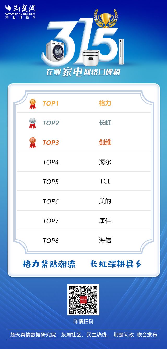 在鄂家電行業網絡口碑榜上,格力、長虹、創維位居前三,康佳和海信因其主流媒體關注度不高,分別位居第七、第八。總的來看,8大家電品牌的自媒體聲量差距很小,這說明網友評價主要體現在產品體驗感上,這對企業提出了更高的要求。