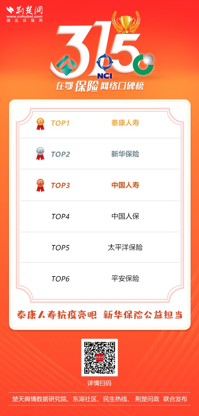 在鄂保險行業網絡口碑榜上,泰康人壽、新華保險、中國人壽位居前三甲,矩陣式、多頻次宣傳報道泰康人壽集團領軍人物陳東升積極助力湖北抗疫及疫后經濟復蘇,讓其網絡口碑高居榜首;向近20萬名最美逆行醫護人員每人贈送近30萬元保額,以及助力湖北脫貧攻堅,讓新華保險收獲好評如潮;平安保險和太平洋保險排名位居第五、第六。