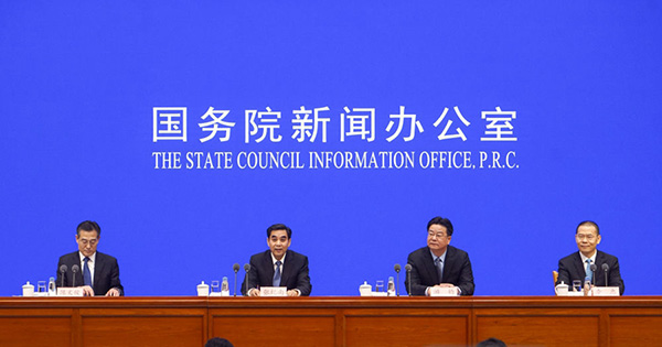2月26日,國務(wù)院新聞辦公室舉行新聞發(fā)布會。人力資源和社會保障部副部長游鈞(右二)在會上透露,人社部正在會同相關(guān)部門研究延遲退休具體的改革方案。 新華社記者殷剛攝
