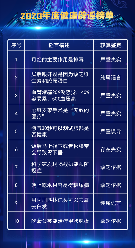 榜單根據(jù)危害、迷惑、熱度三個指標(biāo)綜合評定產(chǎn)生,由北京協(xié)和醫(yī)院、四川大學(xué)華西醫(yī)院等權(quán)威醫(yī)療機(jī)構(gòu)對“心臟支架手術(shù)是‘無效的醫(yī)療’”“憋氣30秒可以測試肺部是否健康”等十個健康類謠言逐一進(jìn)行專業(yè)解讀,去偽存真。晚會在央視頻、新浪微博等平臺同步直播,超過400萬人次在線觀看討論,社會反響良好。