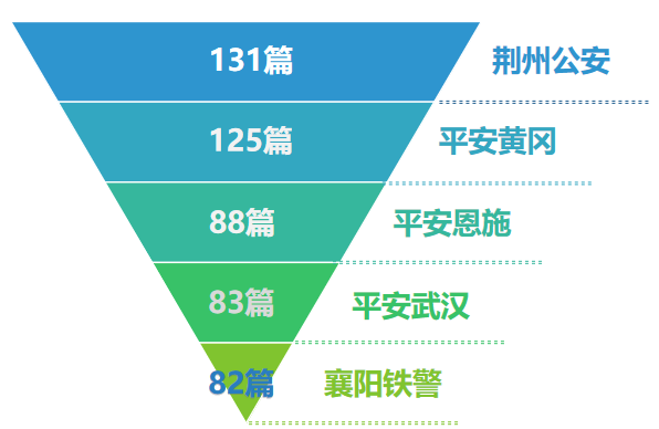 值得關(guān)注的是,“平安黃岡”以125篇的發(fā)布量占據(jù)第二,但平均每篇文章的閱讀量僅有3760次左右,本月沒有文章閱讀量過萬次,文章整體質(zhì)量相對一般。“荊州公安”以131篇的發(fā)布量占據(jù)第一,但文章閱讀總量僅有8.76萬次,每篇文章的閱讀量不到670次。
