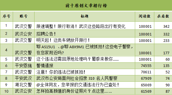 總體來看,2021年2月份湖北公安行業(yè)原創(chuàng)文章閱讀量前十排行中有6篇屬于“交警”系微信號。其中,“武漢交警”4篇文章閱讀數(shù)均突破10萬+,表現(xiàn)依舊十分亮眼,“湖北交警”也有1篇文章入圍前十;“公安”系微信號綜合表現(xiàn)也相對優(yōu)秀,其中,“武漢公安”有2篇文章上榜,“平安恩施”“平安武漢”各攜1篇文章上榜。