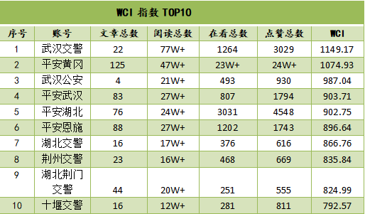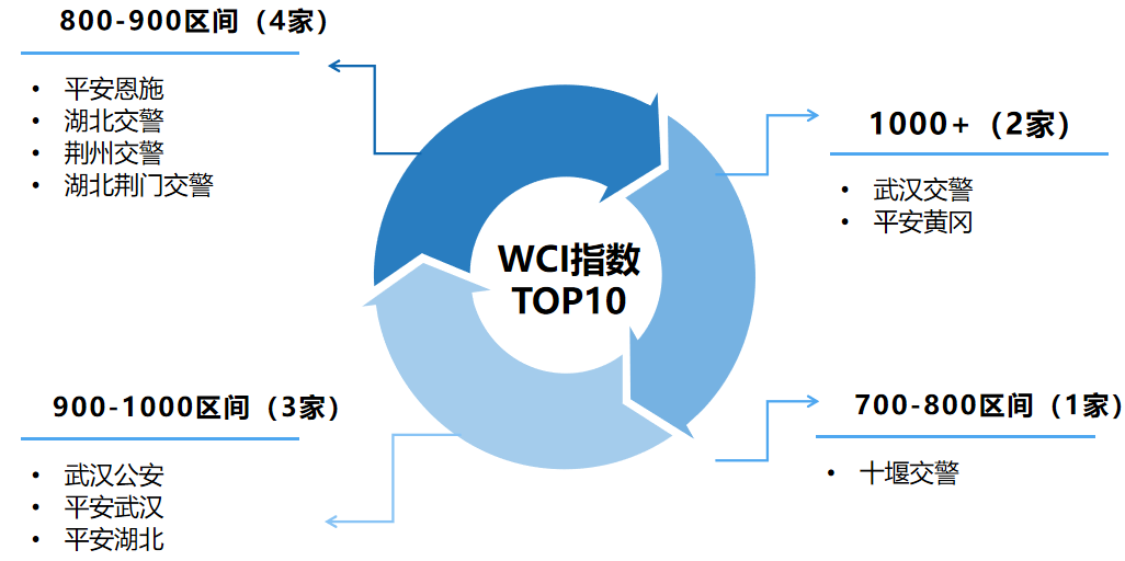 從WCI指數(shù)來看,2月有2家單位WCI指數(shù)突破1000,分別是“武漢交警”“平安黃岡”;WCI指數(shù)在900-1000區(qū)間的單位有3家,分別是“武漢公安”“平安武漢”“平安湖北”;WCI指數(shù)在800-900區(qū)間的有4家,分別是“平安恩施”“湖北交警”“荊州交警”“湖北荊門交警”。整體而言,WCI排名第三至第六的單位各項綜合指數(shù)差距較小,都有沖擊榜單前三的潛力。