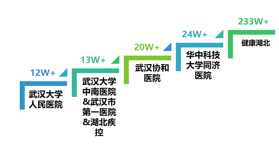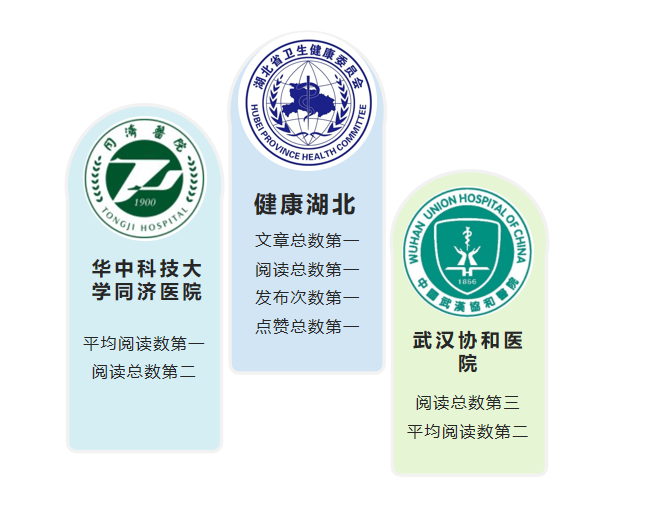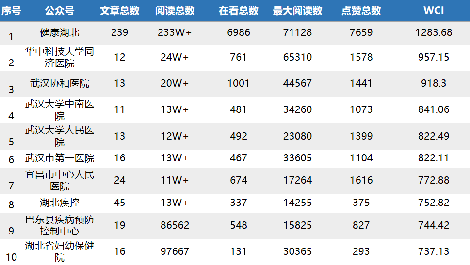 2月,“健康湖北”“華中科技大學同濟醫院”“武漢協和醫院”醫療系統“鐵三角”的排名維持不變。其中,“健康湖北”包攬文章總數、閱讀總數、發布次數、點贊總數等多項運營指標的第一名,成為本期唯一一個WCI指數破千的公眾號。