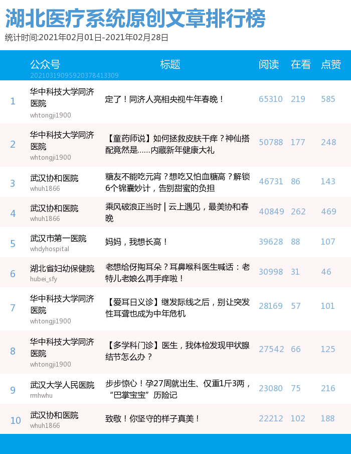 從2月原創文章TOP10來看,共有5家微信號入榜,較上期減少1家,其中“華中科技大學同濟醫院”上榜文章數量最多,有4篇文章入榜;“武漢協和醫院”攜3篇原創文章入榜;“武漢市第一醫院”“武漢大學人民醫院”“湖北省婦幼保健院”均有1篇文章入榜。