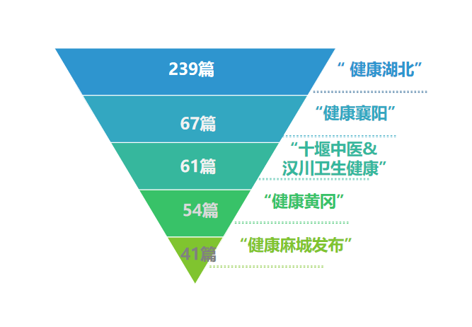 從文章發布總數來看,整體數據較1月份有較大降幅。“健康黃岡”為新晉賬號,“漢川衛生健康”重回榜單。“健康湖北”以239篇穩居第一;“健康襄陽”排名第二,發文量67篇,與冠軍差距較大;緊隨其后的是“十堰中醫”和“漢川衛生健康”,并列第三名,發文量為61篇。