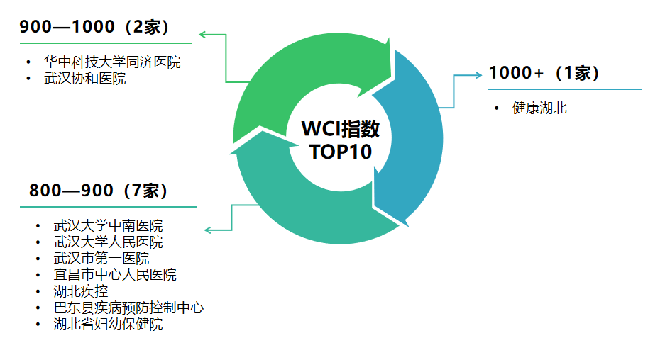 從WCI指數來看,本期TOP10賬號“二八效應”顯著,頭部賬號相對較少,尾部賬號相對集中。其中,超過1000的僅“健康湖北”一家;900-1000區間的從上期的4家減少為2家,分別是“華中科技大學同濟醫院”“武漢協和醫院”;800-900區間的有7家,且出現更替的賬號主要集中在這個區間,地市級醫療賬號受春節假期、運營規律的影響更大。