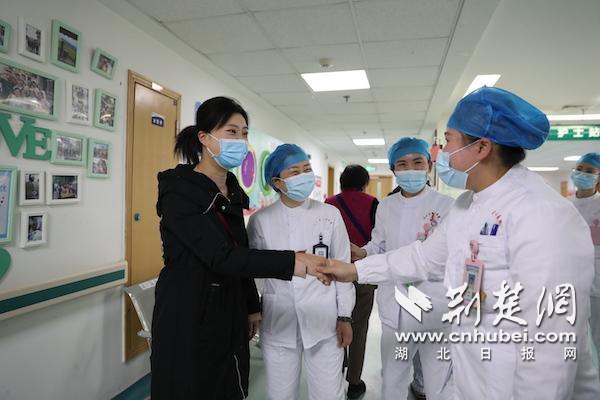 武漢市中心醫(yī)院的領(lǐng)導(dǎo)和醫(yī)護(hù)們早早守候在門診廣場,等待著英雄們的到來。“這是我們?nèi)ツ陸?zhàn)斗過的地方,我們回家了!”來到醫(yī)院,醫(yī)療隊(duì)代表們紛紛發(fā)出感慨。在武漢市中心醫(yī)院醫(yī)護(hù)們的帶領(lǐng)下,醫(yī)療隊(duì)代表們重回自己曾經(jīng)戰(zhàn)斗過的病房,紛紛在病區(qū)合影留念。“這里滿滿都是回憶。”在住院部13樓肝膽胰外科,來自安徽中醫(yī)藥大學(xué)第一附屬醫(yī)院的安徽第七批醫(yī)療隊(duì)隊(duì)員翁菲菲護(hù)士長留下感動的淚水。翁菲菲回憶,“那時(shí)這里是發(fā)熱13區(qū),有不少患者情緒緊張,我們每天就定時(shí)帶領(lǐng)患者們在病房做呼吸操。”當(dāng)時(shí)病房里還有一位90歲高齡的老爺爺,在治療新冠肺炎的同時(shí),還有嚴(yán)重的便秘。為了幫助老人順利排便,翁菲菲特意找來了中藥敷貼,每天為老人貼。