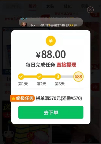 除了一點點累積提現金額,白阿姨看到還有一個按鈕可以直接提現88元,前提條件是完成為期3天的每日任務,這也成了她最后的希望。白阿姨又花了幾十塊,連續兩天都達到任務要求,卻發現第三天的任務是要買足570元的東西才能獲得88元現金,她頓時有種上當受騙的感覺。