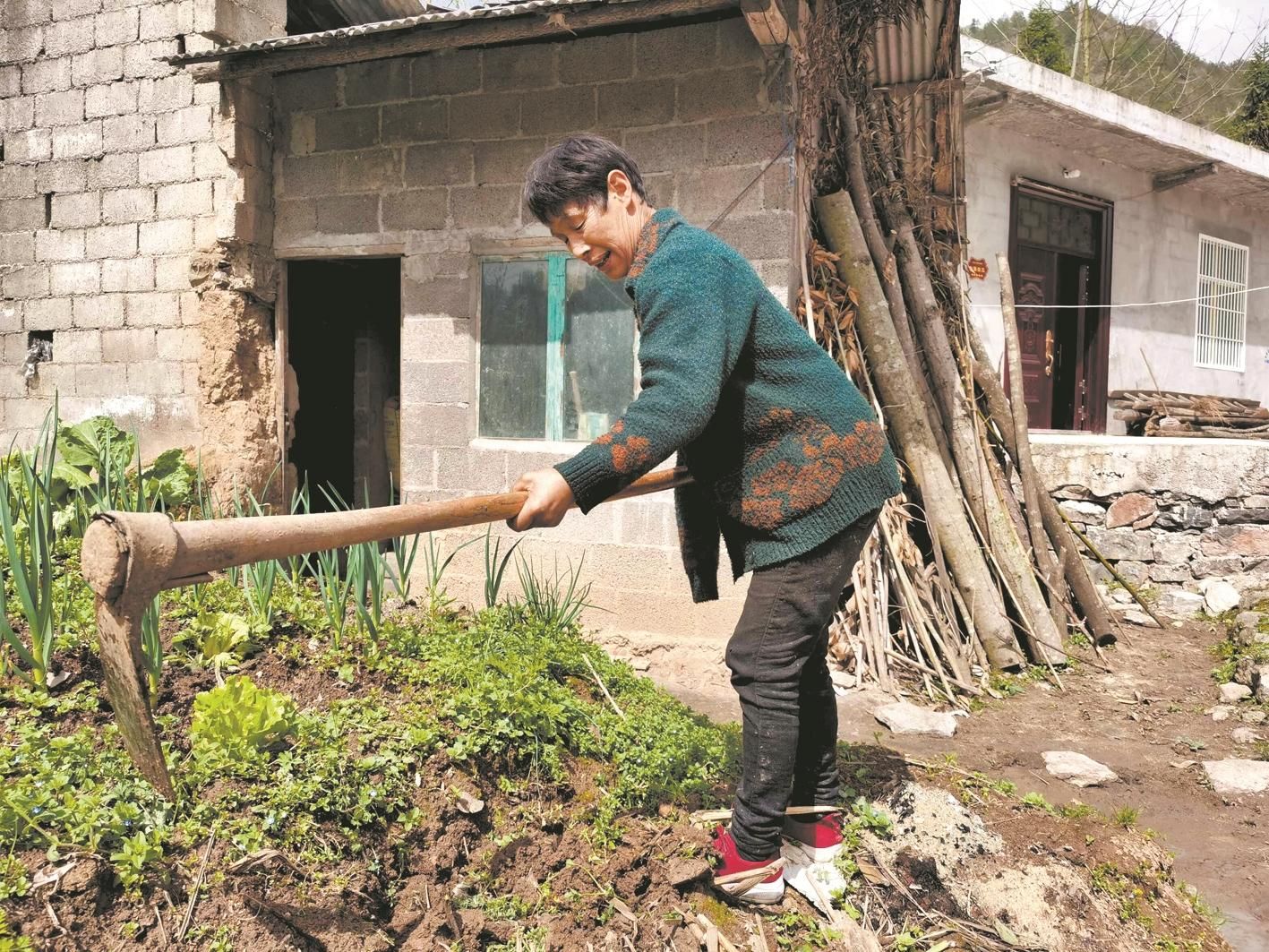 “前幾天下雨,今天出太陽(yáng)了,要抓緊鋤草松土,這段時(shí)間忙春耕,玉米要播種了?!秉S文桂說(shuō)起話來(lái)就愛(ài)笑,一只左手干活十分熟練。她家有2畝多地,種了玉米、紅薯和土豆,從家里走過(guò)去得翻幾個(gè)山頭,步行一個(gè)多小時(shí)。早上煮了點(diǎn)面條后就出門,一直要忙到太陽(yáng)下山才回來(lái)。