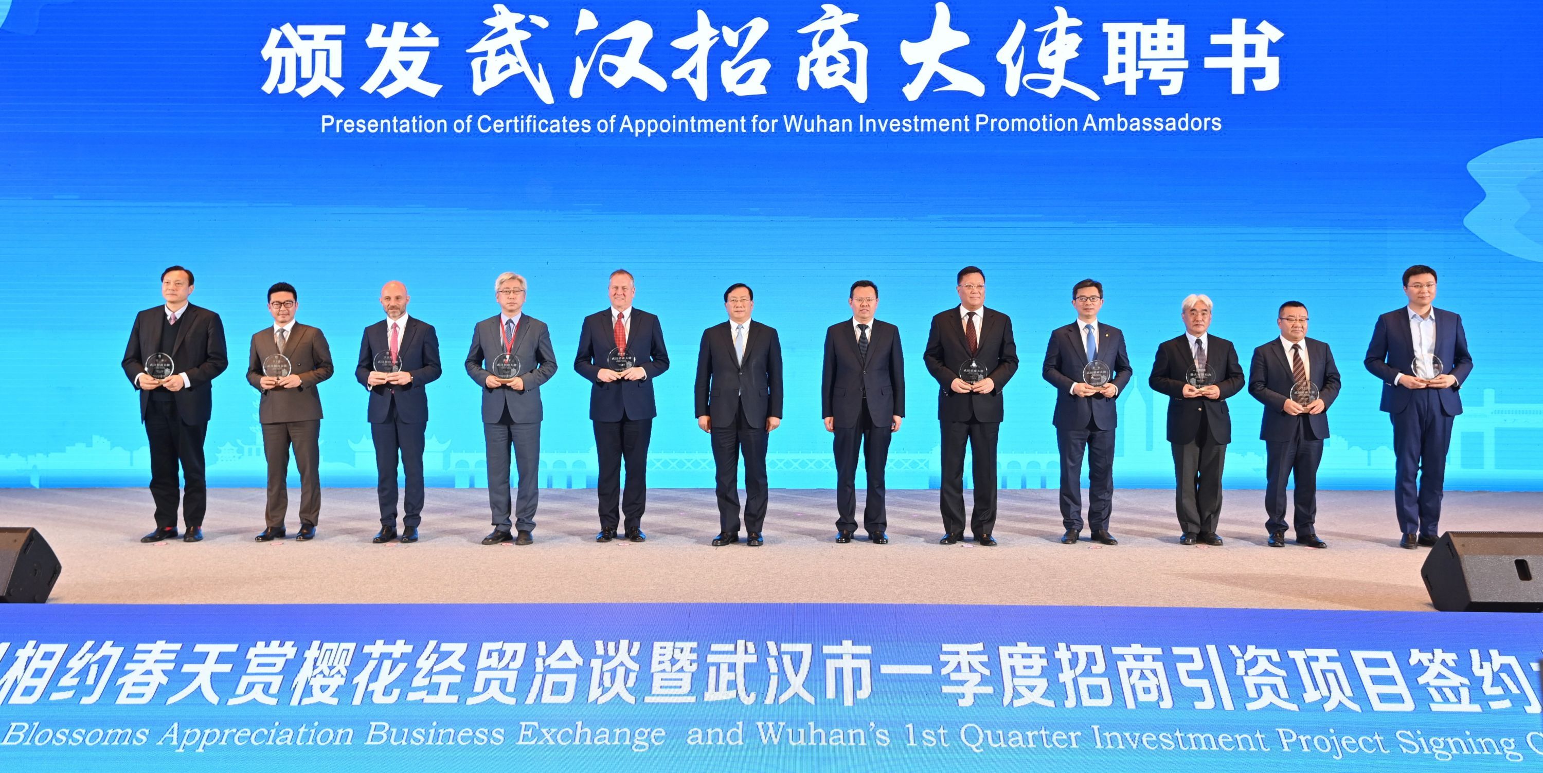 王忠林、程用文與10位新任武漢招商大使合影。長江日報記者郭良朔 攝