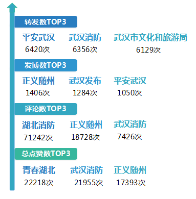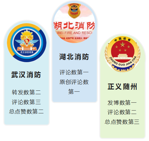 從點贊總數來看,@青春湖北、@武漢消防、@正義隨州 分別位列前三,點贊總數均在2萬余次。