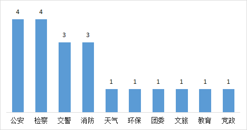 從領域分布來看,本期公安和檢察系統微博號均有4家單位入圍,“第一方陣”入圍單位較上期有所增加;交警、消防系統各有3家微博號入圍,“第二方陣”入圍單位較上期有相應的減少。此外,文旅、天氣、環保、團委、教育、黨政等領域均僅有1家微博號進入榜單前二十,其中教育和團委類微博號為近期首次入榜。