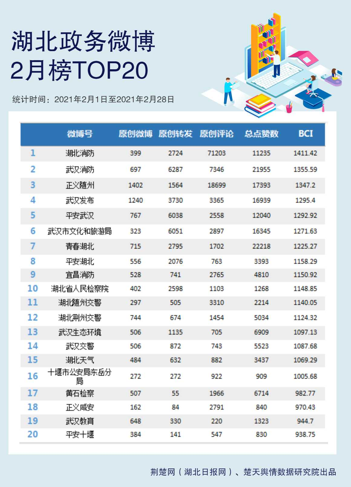 3月29日,由荊楚網(湖北日報網)、楚天輿情數據研究院制作的湖北政務微博2月榜發布。本期榜單前三排名發生較大變化,@湖北消防 本期憑借超高的評論量和原創評論數,從上期11名一躍成為本期第一名;@武漢消防 由上期第三,上升至本期第二;@正義隨州 由上期第一變為本期第三。