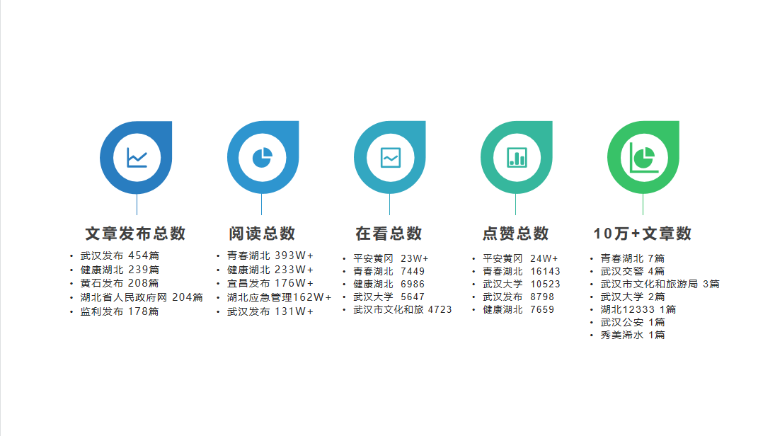 從文章閱讀總數(shù)來看,本期前三名排名不變,“青春湖北”閱讀總數(shù)393萬+次、“健康湖北”閱讀總數(shù)233萬+次、“宜昌發(fā)布”閱讀總數(shù)176萬+次、“湖北應(yīng)急管理”閱讀總數(shù)162萬+次、“武漢發(fā)布”閱讀總數(shù)131萬+次,位列前五。