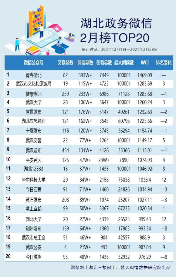 2月WCI指數(shù)前二十榜單中,“青春湖北”仍舊穩(wěn)居第一,“武漢市文化和旅游局”由上期的第五名重回第二名,“健康湖北”降至第三,“宜昌發(fā)布”憾別前三甲。總體來看,無論是發(fā)文總數(shù)、閱讀總數(shù)、在看總數(shù)、點(diǎn)贊總數(shù)、WCI指數(shù)等各項(xiàng)主要指標(biāo),還是閱讀量10W+的文章數(shù)單項(xiàng)指標(biāo),本期均不如上期,尤其是閱讀量10W+文章總數(shù)僅有19篇,這和前兩期(2021年1月64篇、2020年12月41篇)相比差距甚大。