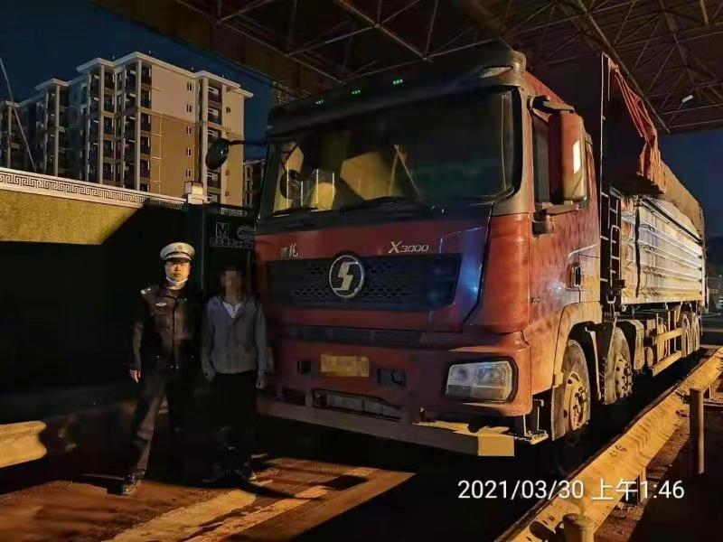 3月30日凌晨1時許,黃陂區交通大隊民警在G318國道攔下一輛重型自卸貨車,檢查時發現,該車運載砂石,經過磅稱重,該車實際載重107噸。原本限重31噸的貨車,超限率為245%,嚴重超載。
